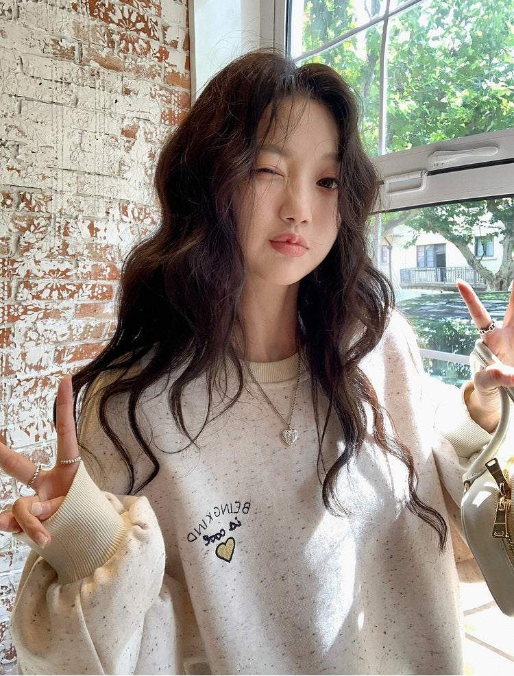 The heart-shaped embroidered letters on the chest are a charming finishing detail.