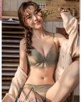 This bra features dual-layer French lace that exudes a fairy-like charm. The lift-and-suspend design prevents sagging, while the scalloped lace trim adds an elegant and sensual touch to the lower band. With thin upper and thick lower sections, it concentrates and enhances the cleavage, creating a flattering silhouette. The high sidebands effectively adjust and smooth out any excess underarm fat. The criss-cross back straps complement backless outfits with a fashionable and chic flair.
