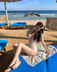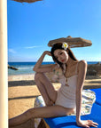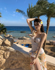 Featuring a bold one-shoulder ruffle design for a stylish and unique look. The subtle chest cutout adds a touch of allure, while the matching sheer cover-up complements the ruffle details. When tied at the waist, it elegantly reveals one leg, creating a lengthening effect.