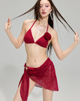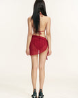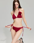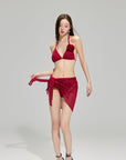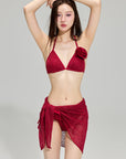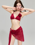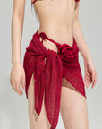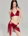 A stunning deep red hue that enhances the skin’s radiance. Crafted from shimmering knit fabric for a refined, high-end feel. The set features sculpted rose embellishments on the top and bottom, adding a unique design touch. Complete with a stylish draped skirt for an extra statement look.