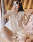夏季甜美蕾丝钩花V领纯欲缎面家居服