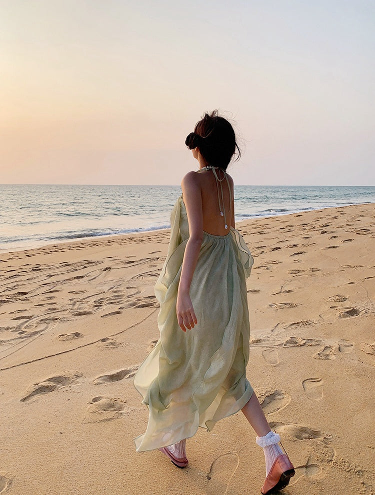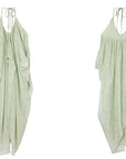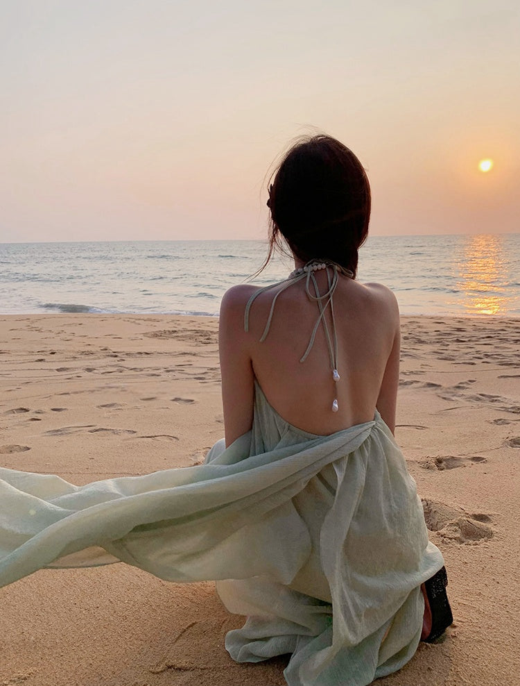 Features include a trendy halter-style V-neckline that elegantly frames the collarbone and neck, offering a subtle and flattering skin-baring effect. The tie straps are adorned with hand-sewn faux Baroque pearls for a sweet, sophisticated touch. Perfect for a breezy, stylish vacation.