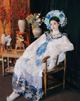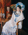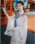 This set is the most beautiful Hanfu available online, featuring an impressive multi-piece design that showcases layering at its finest. The cloud shoulders and skirt embroidery are all hand-stitched, adding intricate detail. The accompanying horse-face skirt is made from lightweight chiffon, ensuring comfort even in the summer heat, with a lovely flowing effect as you move.