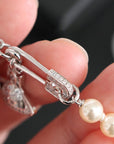 Featuring carefully selected, lustrous pearls that maintain their color over time. The upgraded Egyptian rhinestones boast a 16-facet cut for enhanced brilliance. Designed with a statement brooch-style link for a bold, artistic touch. The pendant’s back is engraved with a logo, adding refined detailing.