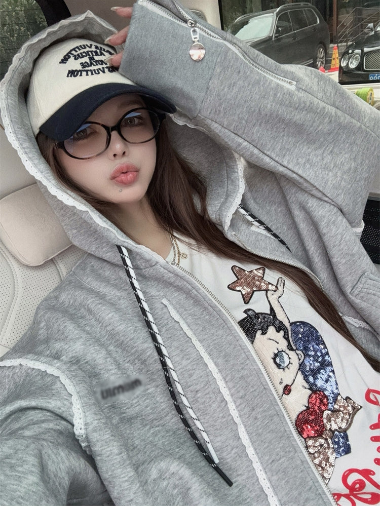 Ruffled Trim Hooded Zip-Up Sweatshirt